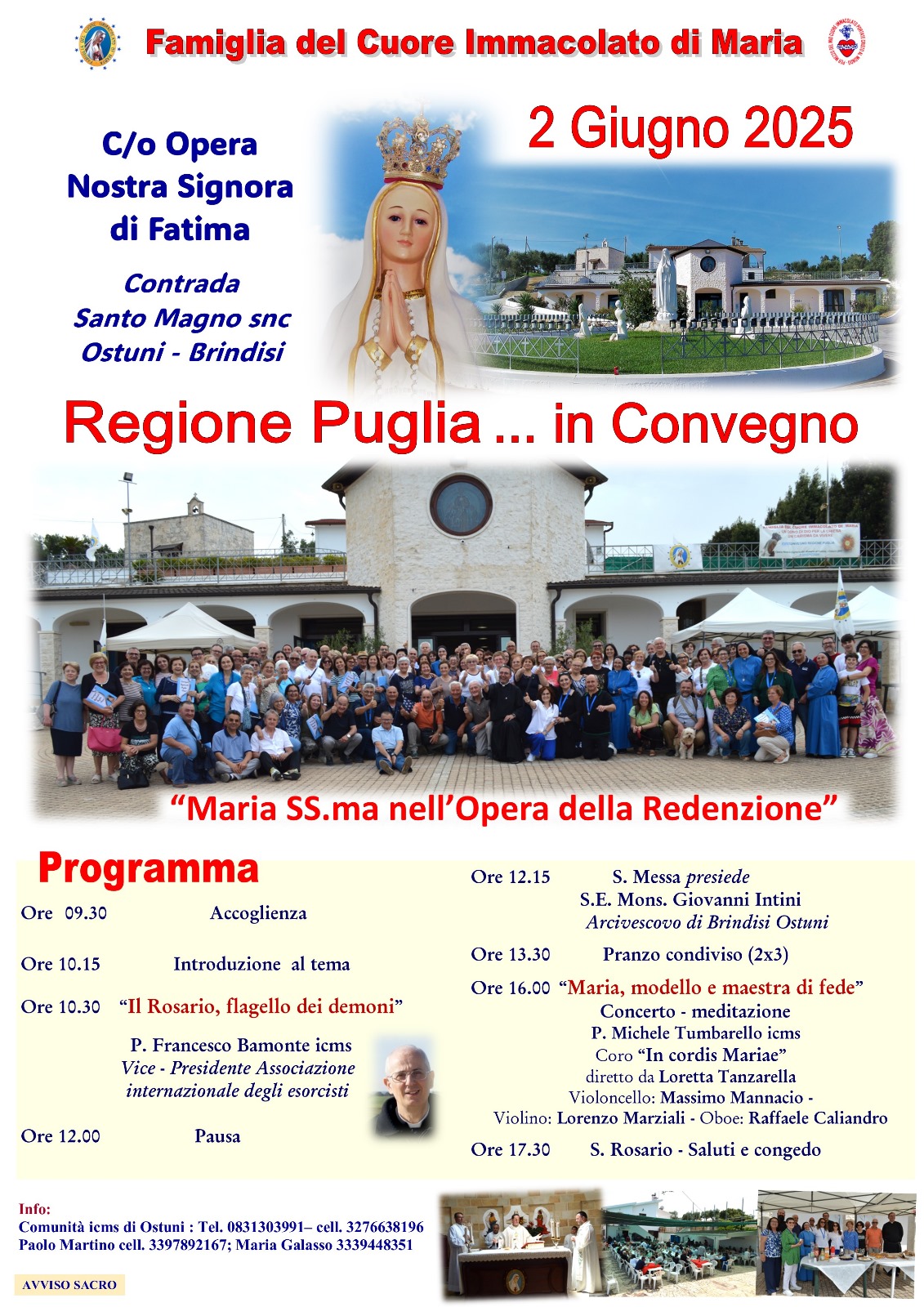 Vi invitiamo a partecipare il 2 giugno qui all'Opera Nostra Signora di Fatima in Ostuni alla giornata di formazione e fraternità dal tema "Maria Ss.ma nell'opera della redenzione". Vi aspettiamo numerosi e vi chiediamo di condividere l'evento sui vostri canali social o gruppi WhatsApp invitando amici e conoscenti a partecipare.
